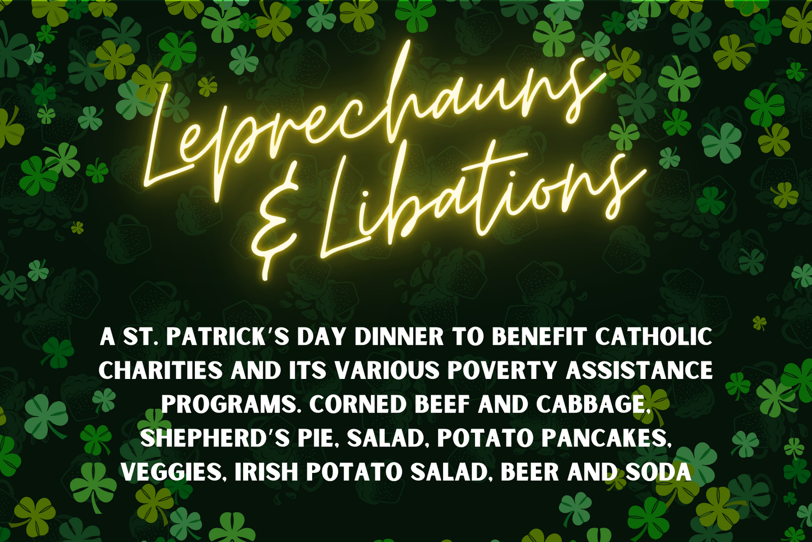 Leprechauns and Libations is our annual St. Patrick’s Day themed dinner and fundraiser to support the poverty assistance programs of Catholic Charities. Enjoy an evening of fantastic food, friends, music and libations! The event will be held on Thursday, March 13, 2025 from 5:30-8:30pm at South-40 1445 South Meadows Parkway Reno 89521